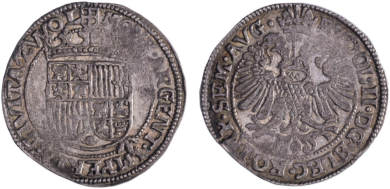 Arendschelling van 6 stuiver z.j. (1601), Vz: Opzettelijk vereenvoudigd gekroond Spaans wapen geplaatst op een kruis van knoestige stokken MONE.ARG.IMPERIA.CIVITA.ZWOL mt stadswapen Kz: Gekroonde tweekoppige adelaar, de borst gedekt door de rijksappel RVDOL.II.D.G.ELEC.RO.IMP.SEM.AVG mmt roos Verk.176.3, CNM.2.52.100, ruim zeer fraai