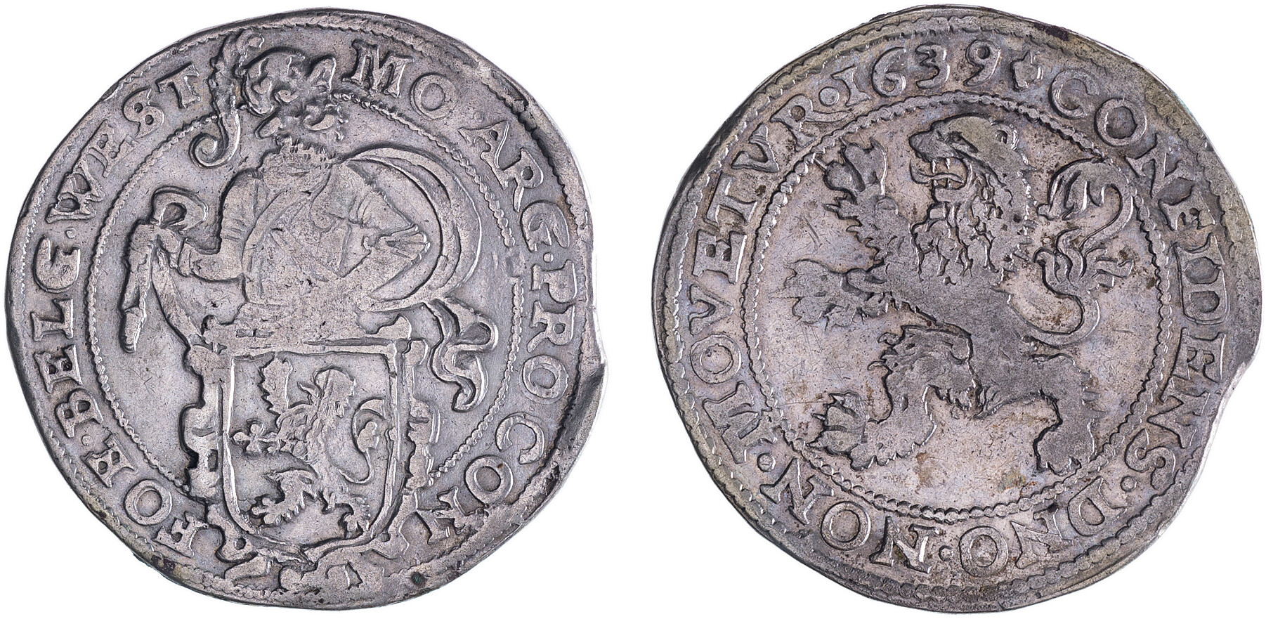 Leeuwendaalder op Generaliteitsvoet 1639, Vz: Geharnaste ridder met een sjerp om, kijkend over zijn linkerschouder, de linkerhand aan het gevest van zijn zwaard en met de rechterhand een schild met een klimmende leeuw aan een lint voor zich staande houdend MO.ARG.PRO.CON - FOE.BELG.WESTF Kz: Klimmende leeuw wel of geen mmt CONFIDENS.DNO.NON.MOVETVR. jaartal., Delm.836, CNM.2.46.24, zeer fraai