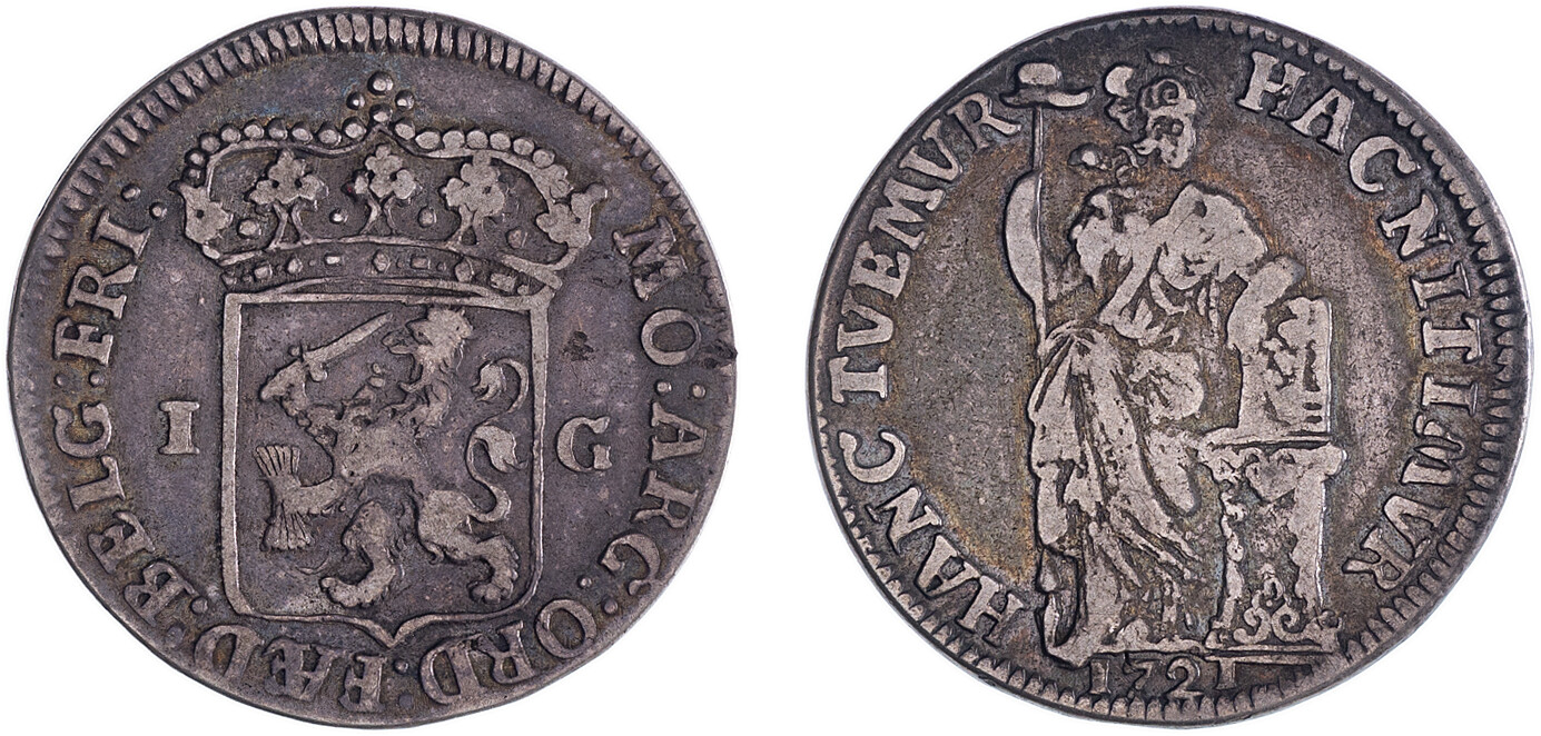 Gulden 1721, Vz Gekroond Generaliteitswapen; gesplitste waardeaanduiding ter weerszijden MO.ARG.ORD.FAED.BELG.FRI. wel of geen mmt Kz Nederlandse maagd, in de rechterhand een speer waarop een vrijheidshoed, met de linkerelleboog steunend op een rechtop op een zuil staande bijbel; jaartal in de afsnede HAC NITIMVR - HANC TVEMVR, Delm.1183, CNM.2.16.99, ca. zeer fraai