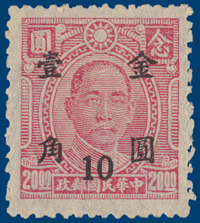 CHINA, Mi.889, 892, 10c. on 1$ green and 10c. on 20$ rose, unused, very fine