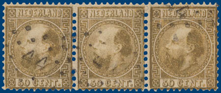 12IA (3x), 50ct goudkleur Kt.12¾:11¾ type I, in gebruikte horizontale strip van drie, pracht ex.
