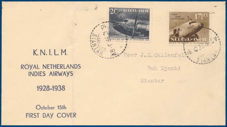 239/240, K.N.I.L.M. 1938, op officiële first day cover met 1e dag stempel 15-10-'38 uitgave S.J. Sluis, Enkhuizen, met getypt adres, klep open, vertikale vouw door cover overigens pracht ex., in catalogus genoteerd met RRR dus zeer zeldzaam!!